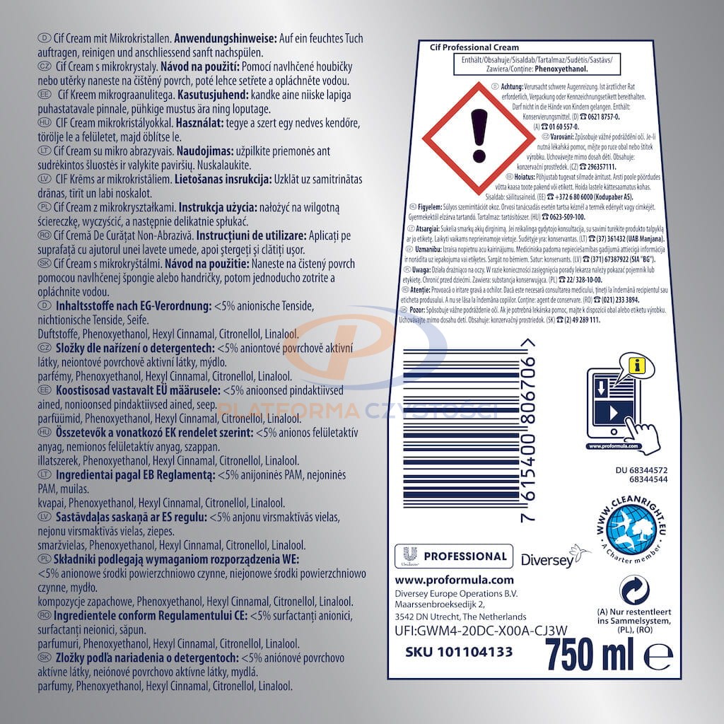 Nakładaj krem Cif bezpośrednio na powierzchnie lub na szmatkę. Wytrzyj powierzchnię, a następnie dokładnie opłucz czystą, świeżą wodą. Dla delikatnych powierzchni i materiałów, wszelkich nowych/nietypowych zastosowań, powierzchni malowanych i aluminium, testuj Cif najpierw nałóż profesjonalny krem na niewidoczne miejsce, spłucz natychmiast po użyciu i unikaj intensywnego pocierania. Nie używaj na linoleum, skórze lub tekstyliach, i unikaj długotrwałego kontaktu z malowanym drewnem i aluminium. Nadaje się do vitroceramiki (pozostawić płytkę do ostygnięcia przed dokładnym czyszczeniem).