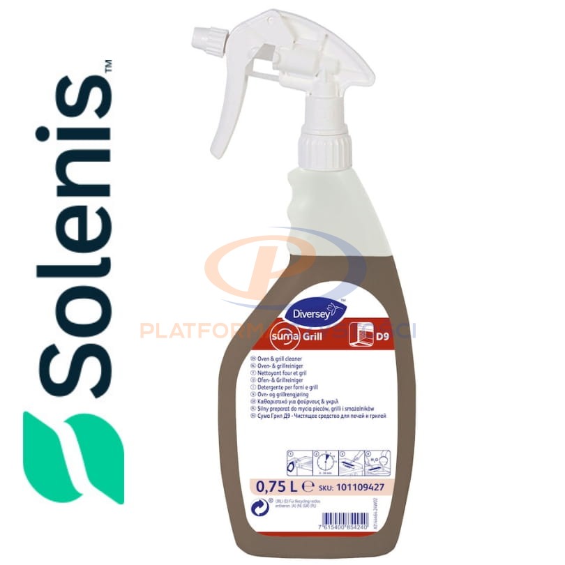 Suma Grill D9 jest bardzo silnym, alkalicznym preparatem do okresowego czyszczenia uporczywych zabrudzeń spowodowanych głównie nagromadzeniem się tłuszczu oraz zwęglonych resztek żywności na powierzchni pieców, grilli oraz smażalników. Suma Grill D9 jest mieszaniną rozpuszczalników, substancji alkalicznych i środków powierzchniowo czynnych, dzięki czemu skutecznie usuwa nawet zwęglone resztki żywności. Rozcieńczony produkt można zastosować do czyszczenia smażalników metodą namaczania.