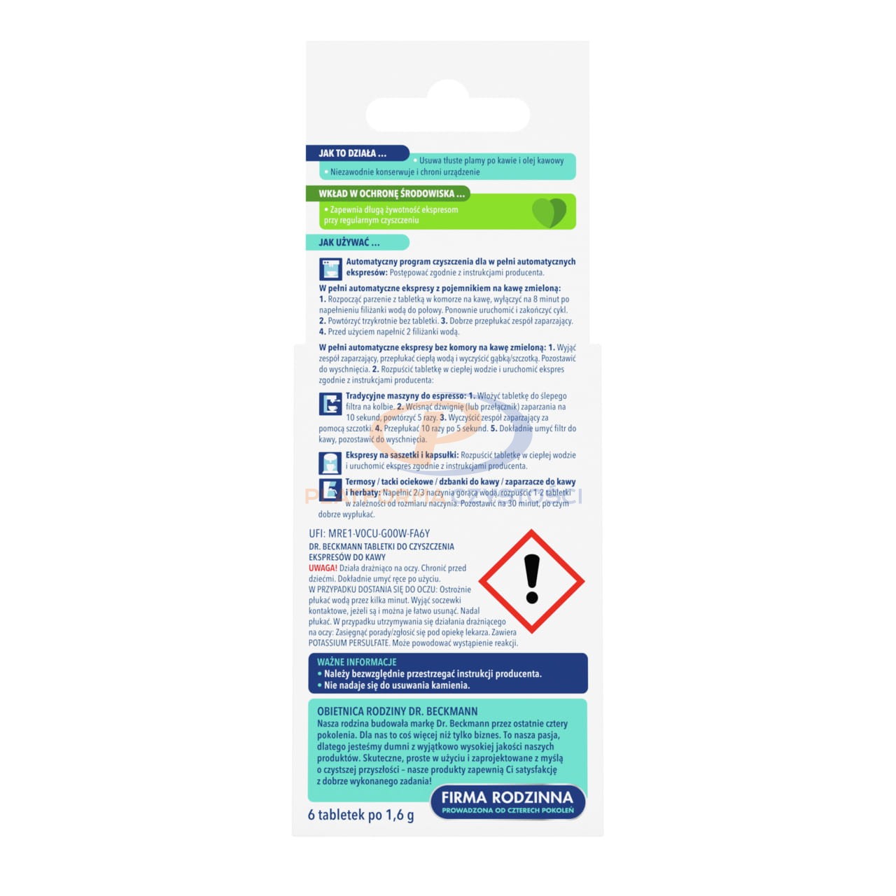 Dr. Becmann Aby cieszyć się nie tylko wyśmienitym smakiem ulubionej kawy, ale także zapewnić swojemu ekspresowi długą żywotność, warto pamiętać o jego systematycznej pielęgnacji. Przy każdym użyciu na elementach urządzenia osadza się warstwa tłuszczów i olejów naturalnie obecnych w ziarnach kawy, co z czasem może negatywnie wpływać na jego działanie. Tu z pomocą przychodzą tabletki do czyszczenia ekspresów marki Dr. Beckmann, które skutecznie usuwają wszelkie osady, dbając jednocześnie o bezawaryjną pracę Twojego ekspresu i niezrównaną jakość parzonej kawy.