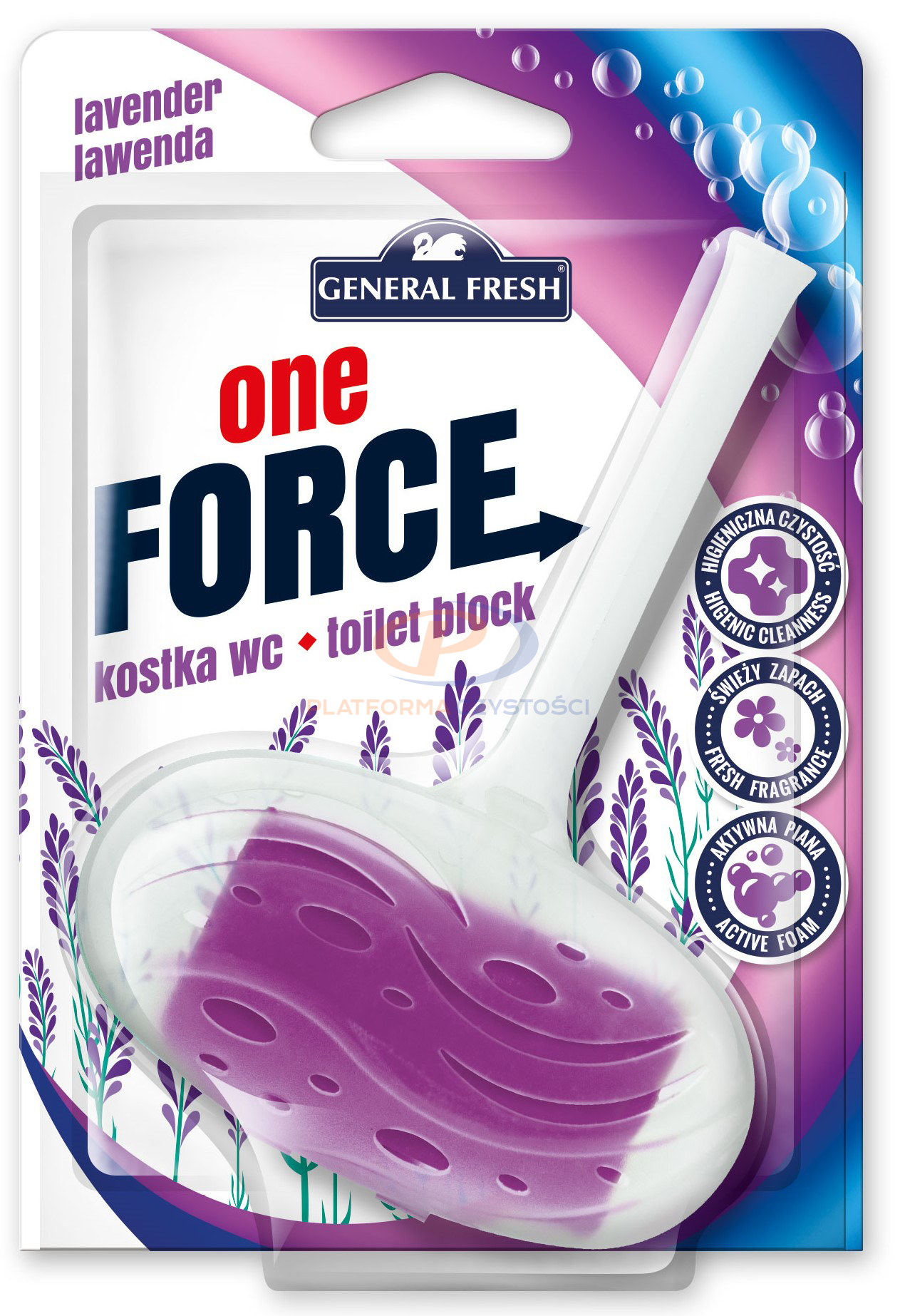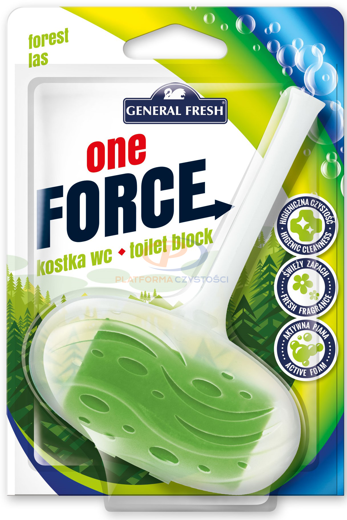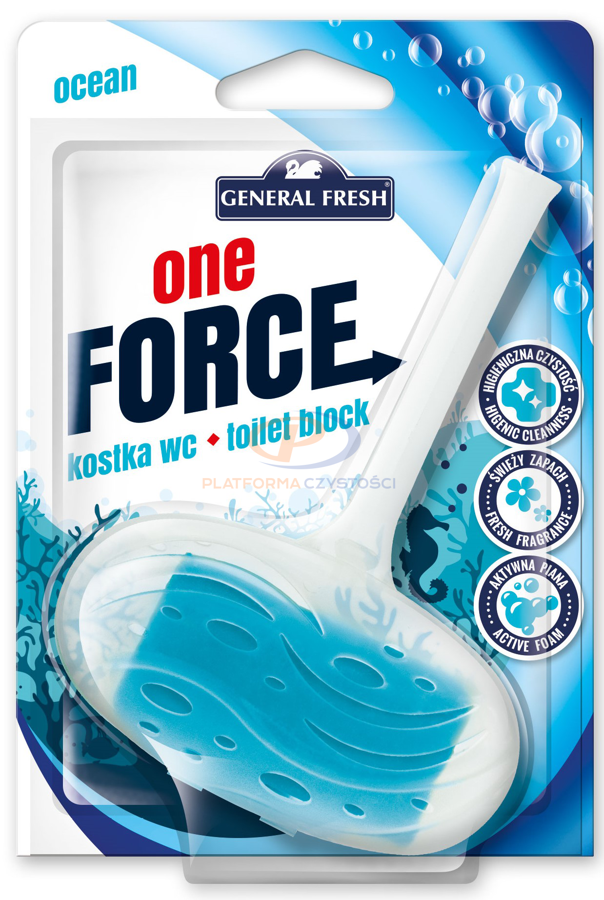 Kostka toaletowa General Fresh One Force 40g posiada specjalnie dobrane składniki, które myją muszlę klozetową oraz zapobiegają osadzaniu się kamienia. Przy każdorazowym spłukiwaniu odświeżają i tworzą obfitą pianę nadając świeży zapach.