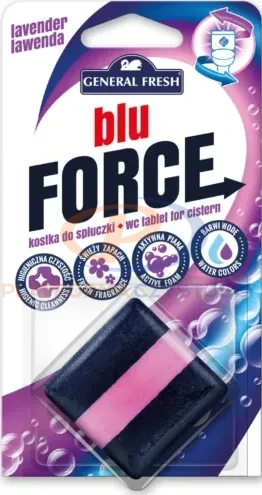 BLU FORCE kostka barwiąca do spłuczki z detergentem umieszcza się w zbiorniku z wodą (spłuczce), który zasila muszlę toaletową. Tabletka stopniowo rozpuszcza się w zbiorniku uwalniając detergent, który czyści zbiornik na wodę, nie dopuszcza do osadzania się kamienia wapiennego, eliminuje bakterie i mikroorganizmy. Po każdym spłukaniu kostka tworzy obfitą pianę, pozostawiając w łazience przyjemny zapach.