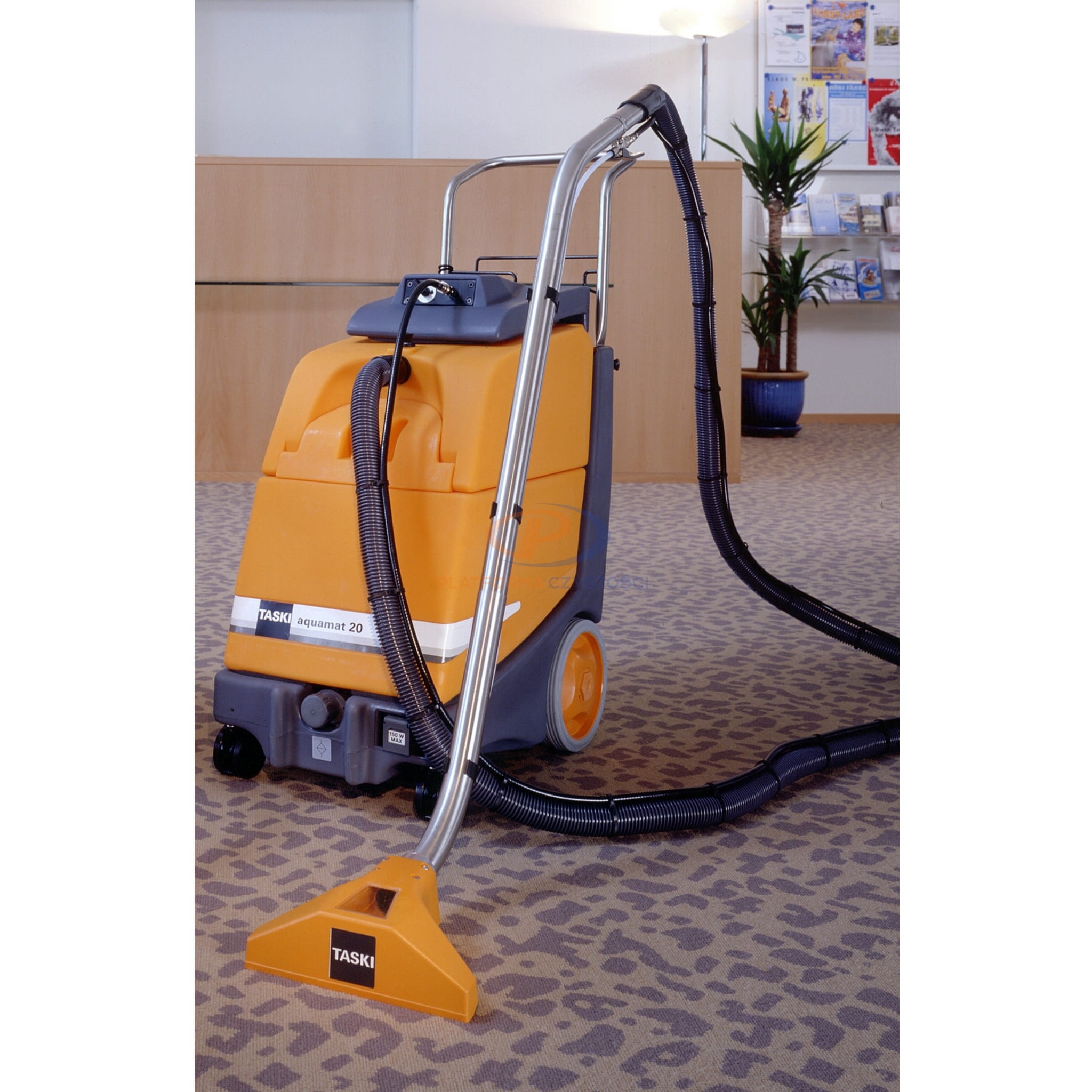 TASKI Aquamat 20 to trwałe, proste w budowie i wysoce bezawaryjne urządzenie przeznaczone do prania wykładzin, dywanów i tapicerki metodą: natryskowo-ekstrakcyjną. Ten najczęściej stosowany sposób polega na tym, że pompa pod ciśnieniem natryskuje wodę z detergentem znajdującą się w odrębnym zbiorniku wewnątrz maszyny na tkaninę i przenikając jej strukturę rozpuszcza zalegający tam brud. Właściwa końcówka, którą nakładamy na wąż ssący bądź rurę wciąga ten zanieczyszczony płyn do zbiornika. Dzięki tej metodzie, która analogicznie odpowiada praniu tkanin ręcznie lub w wirówce możemy wyczyścić materiały, których nie da się łatwo zdjąć i wrzucić do pralki, chociażby z uwagi na ich wielkość czy przytwierdzenie do mebli.